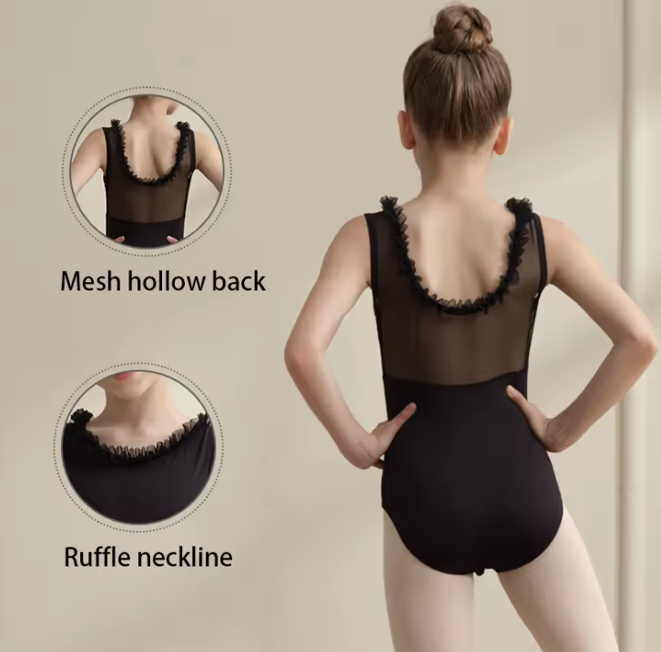 Girls Ruffle Neckline, Soft Mesh, Splicing Hollow Back Leotard