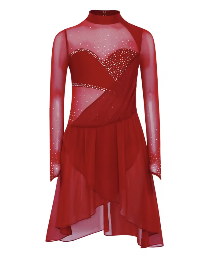 Designed for young performers, this stunning dance dress combines elegance, comfort, and stage-ready sparkle. The long sheer mesh sleeves and delicate patchwork detailing create a graceful silhouette, while the mock neck and keyhole back add a stylish and modern twist.