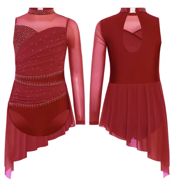Featuring an elegant asymmetrical design—with one long sleeve and one sleeveless arm—it creates a unique and dynamic look. The high-low mesh panel skirt flows gracefully, showcasing the beauty of dance in motion.