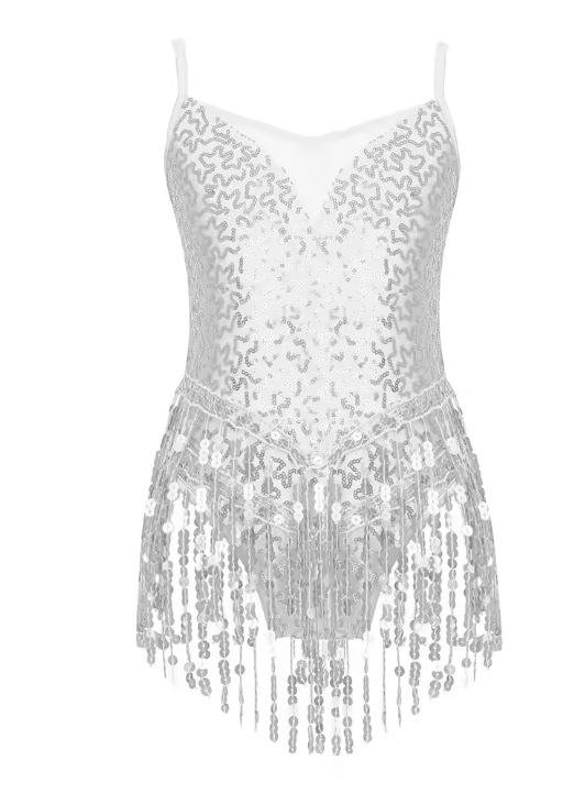 This sparkling sleeveless dance leotard is designed to shine under the spotlight, featuring adjustable spaghetti straps, a shimmering sequin finish, and a playful tassel hem for beautiful movement.