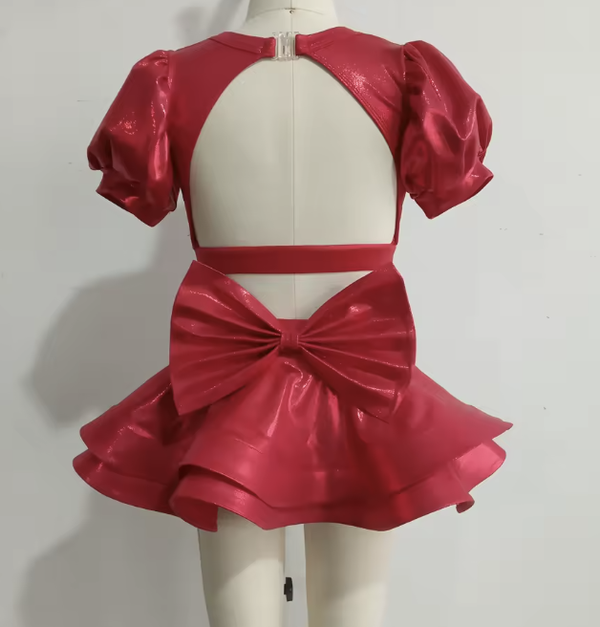 The high-waisted shorts are accented by layered, sculpted side peplums that create dramatic movement, while the back showcases a statement bow for extra stage impact. Available in a range of bold colours and prints, this costume is designed to turn heads under the lights.