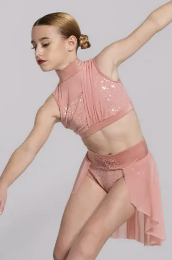 This stunning two-piece performance set combines elegance with stage-ready sparkle. Designed with iridescent sequins and sheer mesh details, it delivers both impact and comfort for dancers of all levels.
