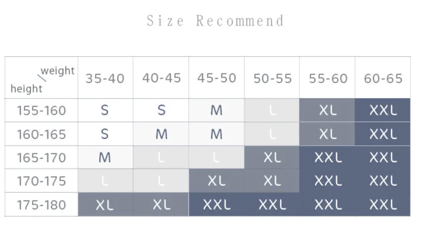 Sizes: S (155–160cm), M (160–165cm), L (165–170cm), XL (170–175cm), XXL (175–180cm)