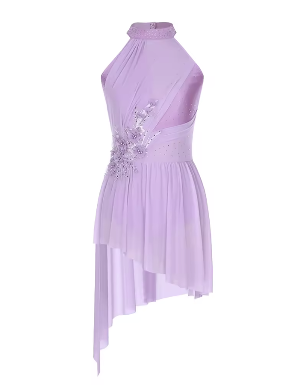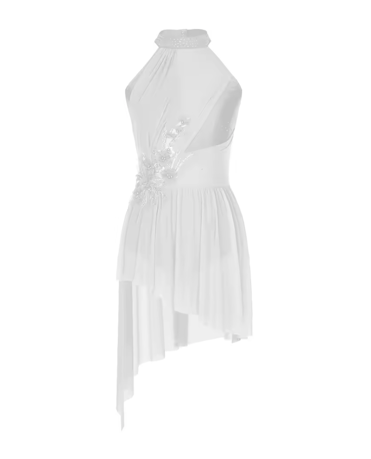 The dress features a flattering backless design with four slim straps to highlight beautiful back lines, secured with a mock neck and press-button closure for ease of wear. A flowing mesh skirt with an asymmetrical hem enhances movement, creating a captivating effect with every turn and leap. Built-in briefs provide extra coverage and confidence while you perform.