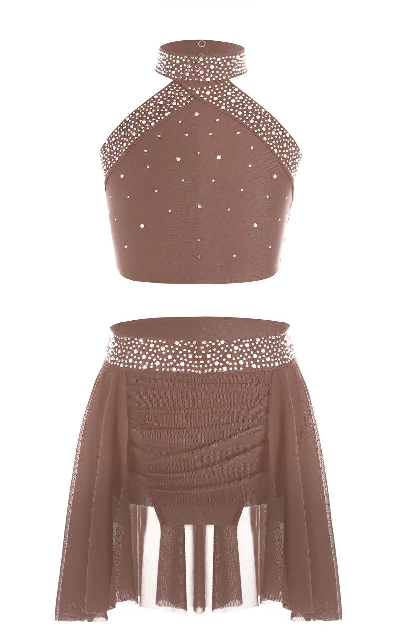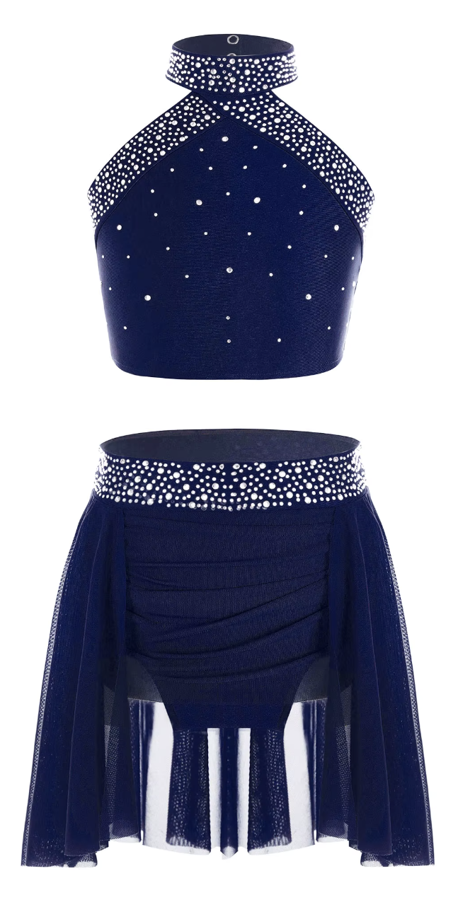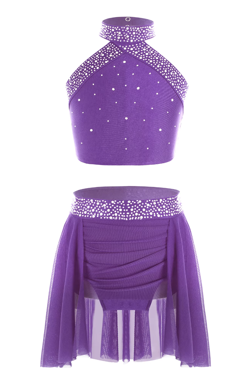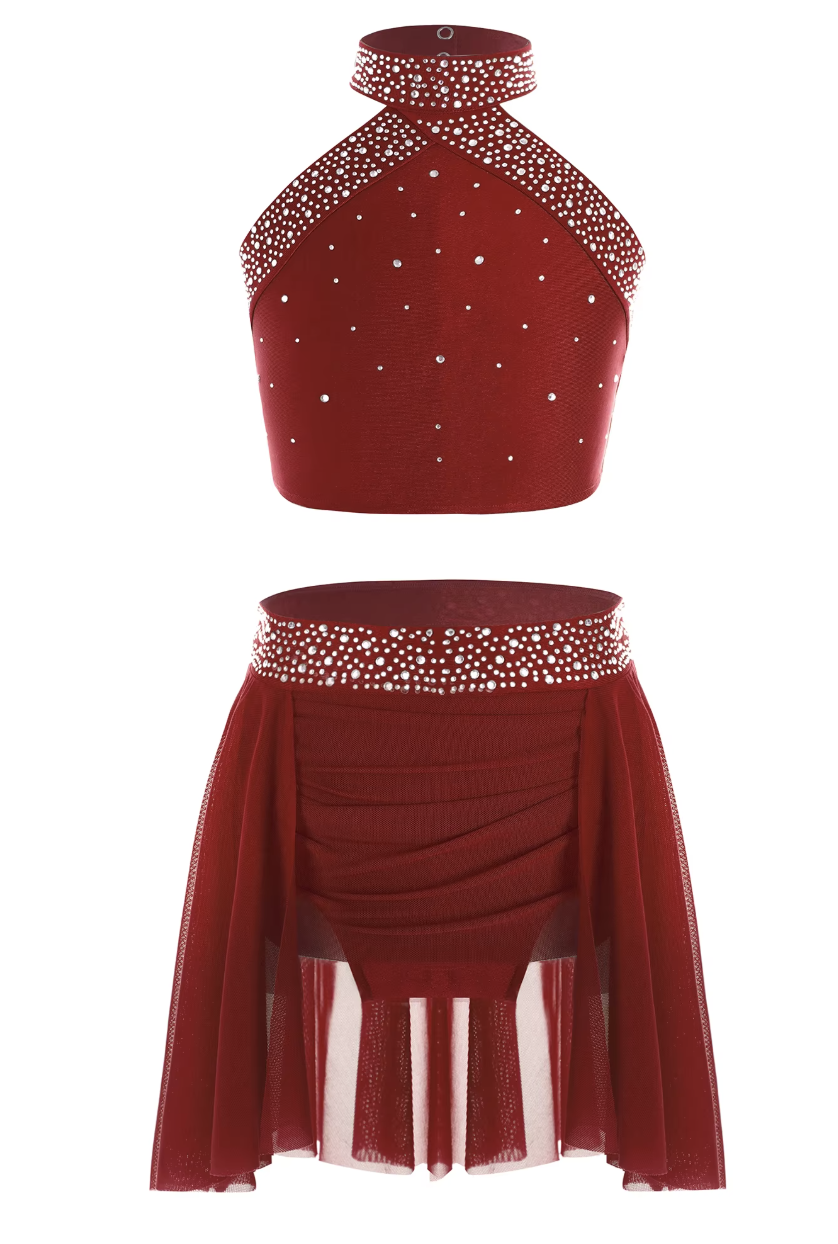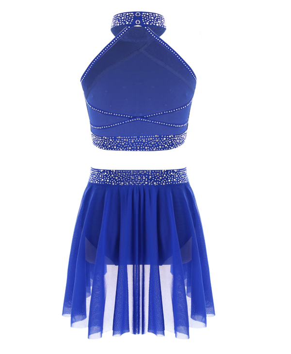 Shine with confidence in this stunning Sparkly Rhinestone Dance Set, designed for young performers who love to stand out on stage. This elegant two-piece set features a glittering rhinestone crop top and a matching chiffon-style skirt, perfect for modern, lyrical, or contemporary dance, and even figure skating performances.