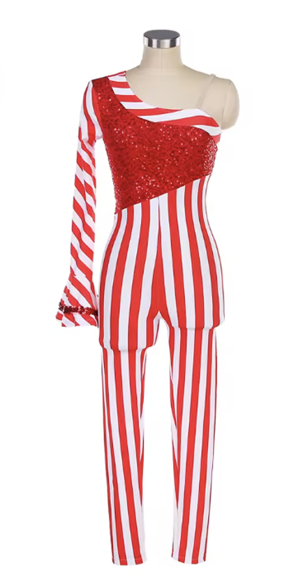 Bring festive sparkle to the stage with this striking candy cane–inspired dance unitard. Featuring bold vertical red and white stripes, this one-shoulder design combines playful holiday charm with a sleek, professional silhouette.