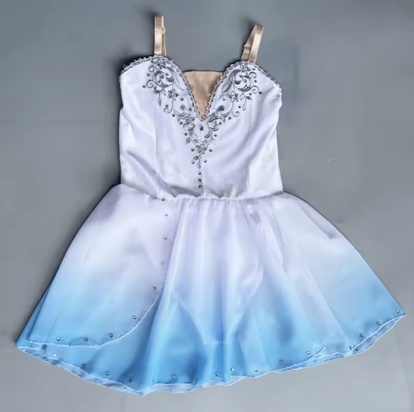 The Frosted Elegance Ballet Dress combines beauty and performance, perfect for young dancers on stage or at recitals. Featuring a white chiffon bodice detailed with silver appliqué and rhinestones, the dress flows into a layered chiffon skirt that fades into a delicate icy blue. The sparkle embellishments add just the right amount of shine under stage lights, creating a magical presence for any performance.