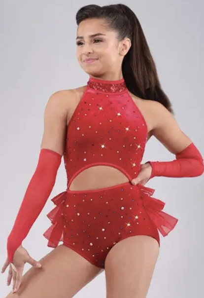 This luxurious velvet leotard, accented with sparkling gemstones, features a secure snap closure for comfort and ease. The petite sequin mock neck and back bandeau overlay add a touch of refined glamour, while the organza three-tier bustle with ruffled hem creates stunning stage movement.